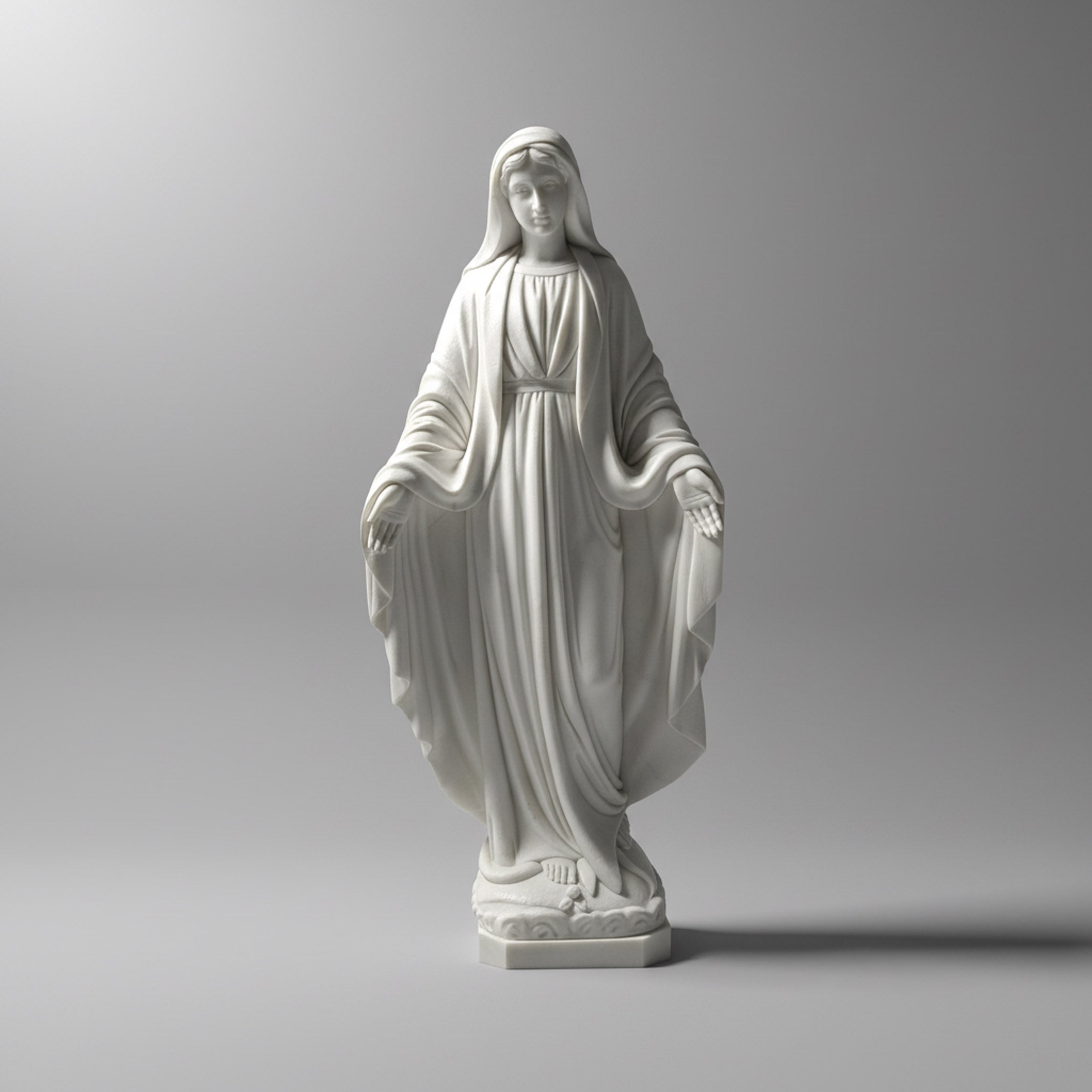 This life size marble statue features a tall, welcoming build of the Blessed Virgin Mary in a classic pose of grace. Hand-carved from premium white marble, the figure stands with arms outstretched and palms open, set upon an eccentric cloud-motif base that represents her heavenly presence. The build is characterized by a slender, vertical silhouette and the masterful carving of her veil, which drapes elegantly over her shoulders. Finished with a soft matte luster, the sculpture showcases deep-relief rhythmic folds in her robes that create a realistic sense of weight and movement, making it a monumental spiritual centerpiece for any cathedral or estate garden.
