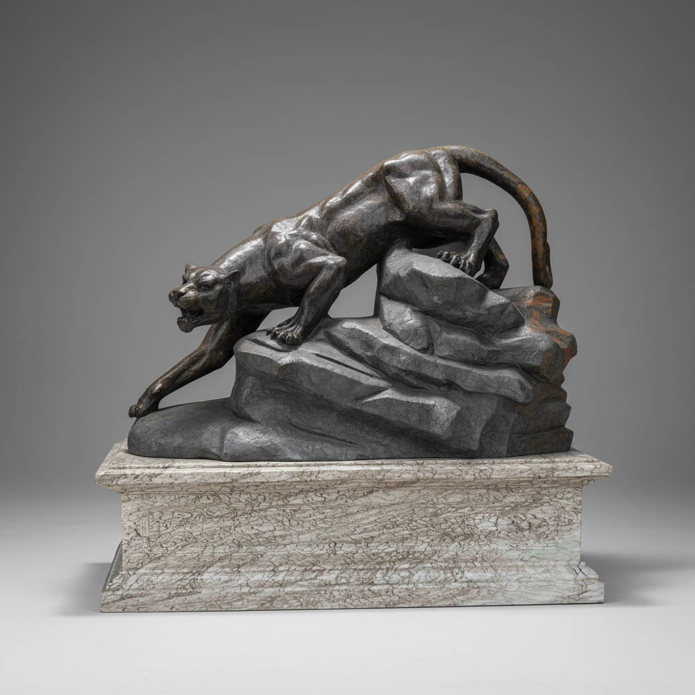 A formidable hand-carved black limestone panther statue, poised in a sleek, predatory crouch atop a natural rock formation. Its powerful form and intense expression create a captivating focal point on its robust pedestal