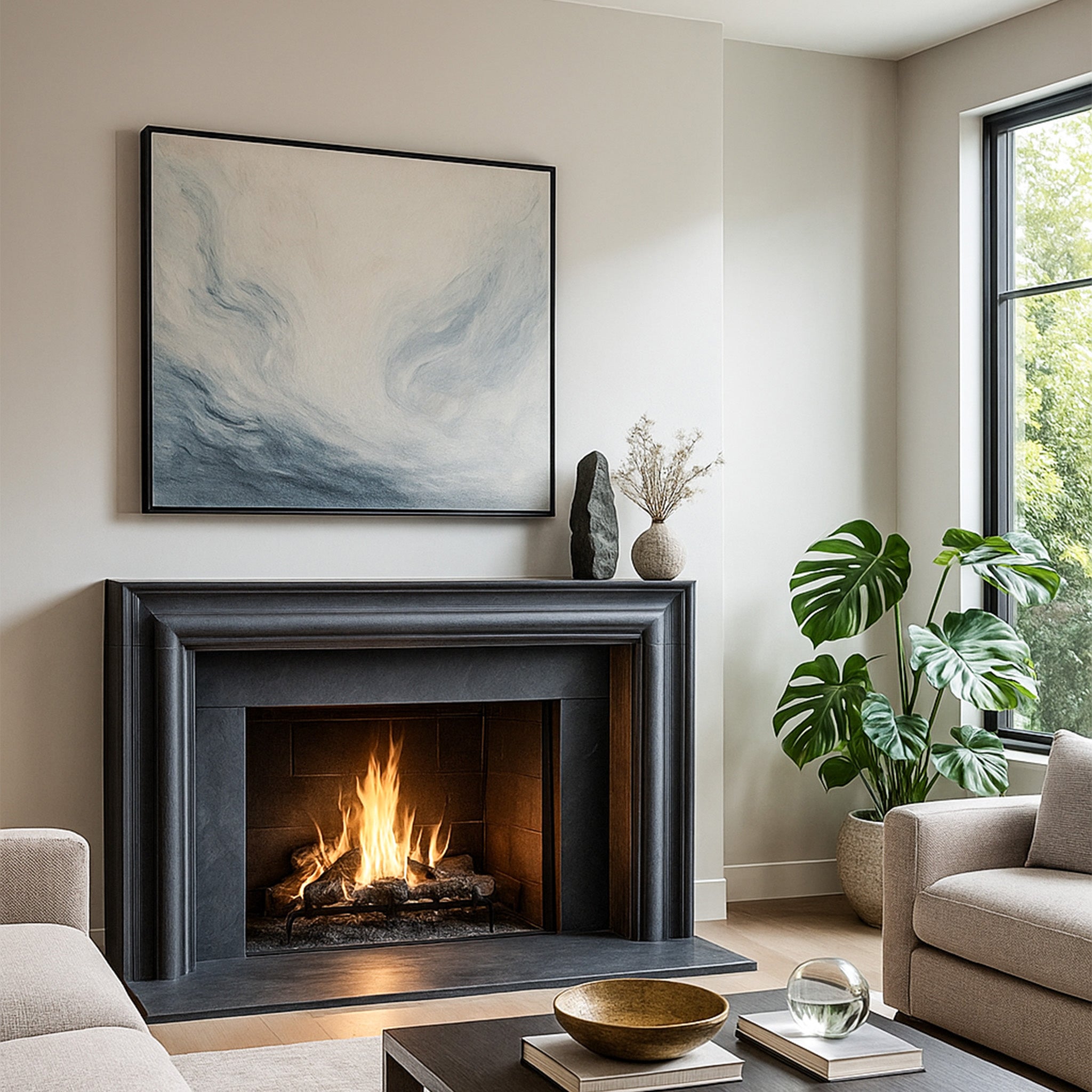 This sturdy fireplace surround, crafted from solid Black Limestone, exudes a powerful, earthy elegance. Its minimalist design features a clean, substantial frame with a slightly tapered profile that adds a touch of architectural interest. The natural, understated texture of the limestone provides a warm, rustic appeal, while the dark hue ensures it makes a bold statement. Perfect for modern industrial, farmhouse, or traditionally styled interiors seeking a robust and enduring focal point.