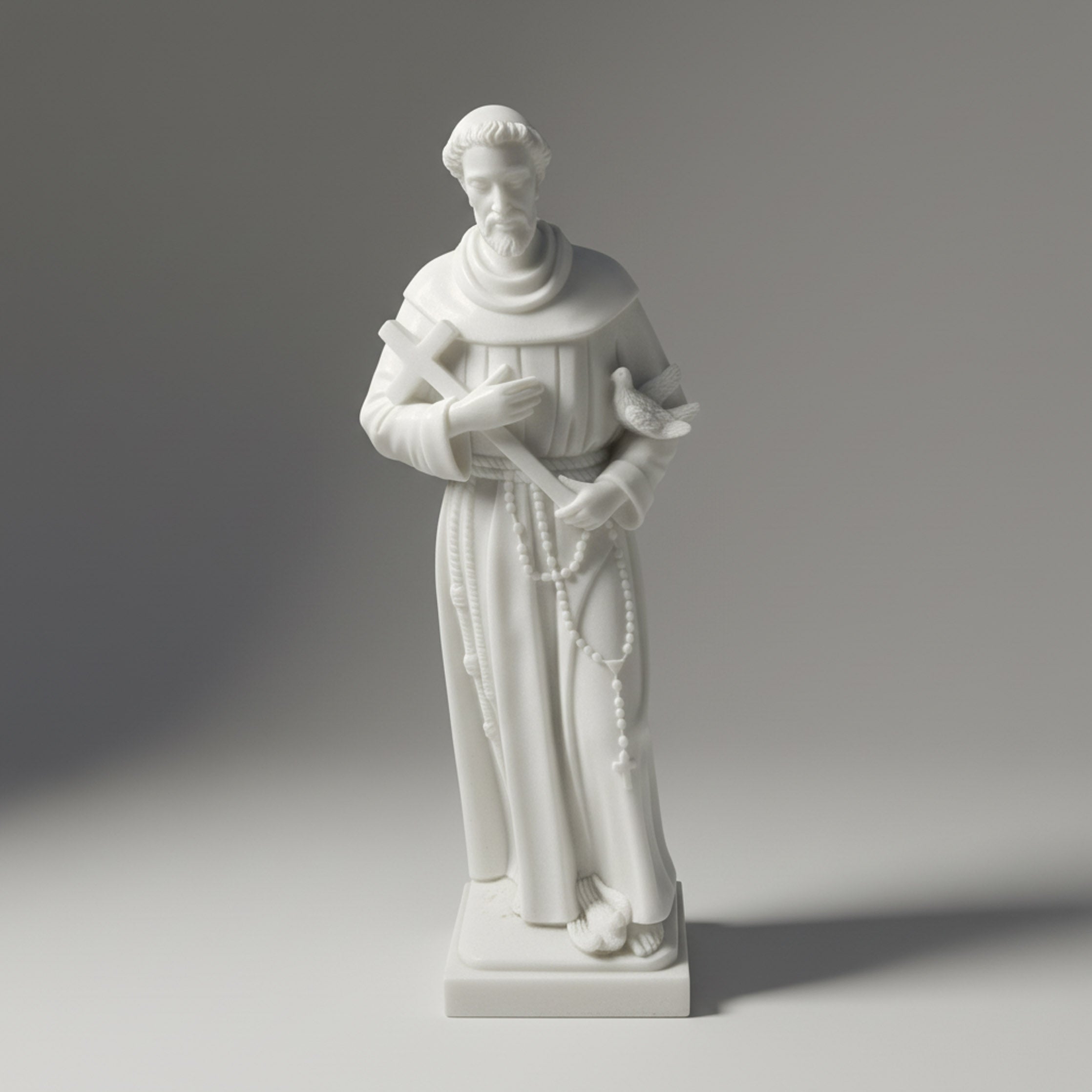 This white marble religious statue features a humble, upright build of Saint Francis of Assisi, the patron saint of animals and the environment. Hand-carved from solid natural stone, the figure is depicted in his traditional monk's habit, secured with a knotted cord belt. An eccentric feature is the presence of two hand-carved birds: one resting peacefully on his shoulder and another nestled at his feet upon the square integral base. The build is characterized by a slender, vertical silhouette and a soft matte finish that highlights his serene facial expression and the protective way he cradles a small cross against his chest.
