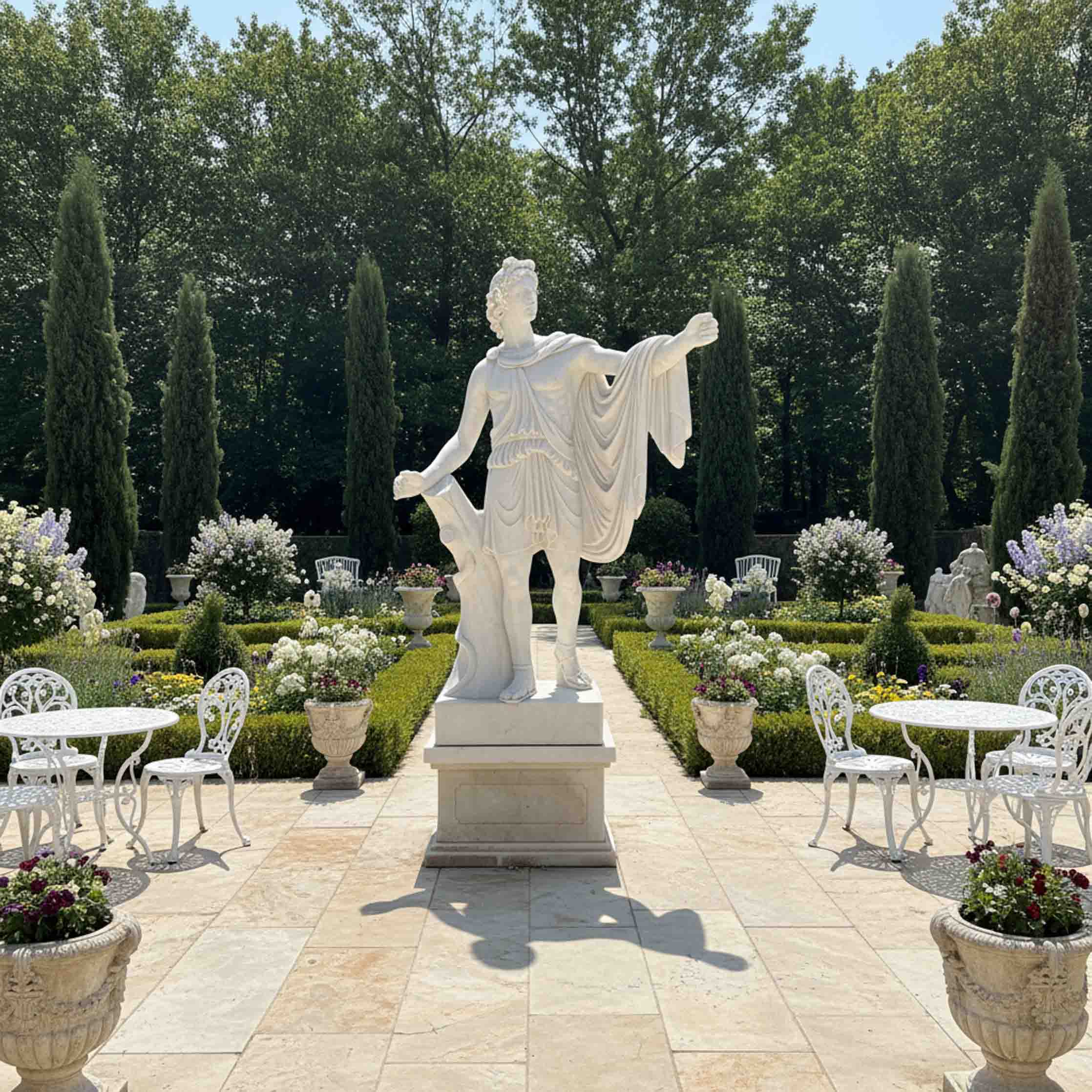 This marble sculpture for sale depicts a commanding Greek hero, captured mid-stride with one arm extended as if addressing a crowd or preparing to cast a spear. He wears a short, classical tunic cinched with a gathered sash, while a sweeping cloak drapes over one shoulder and down his back in deep, rhythmic folds. Sandaled feet plant firmly on a stepped plinth, aided by a carved tree trunk support that adds stability and natural detail. Carved from pale white marble, this majestic figure is ideal for grand entrances, courtyards, or formal garden axes.