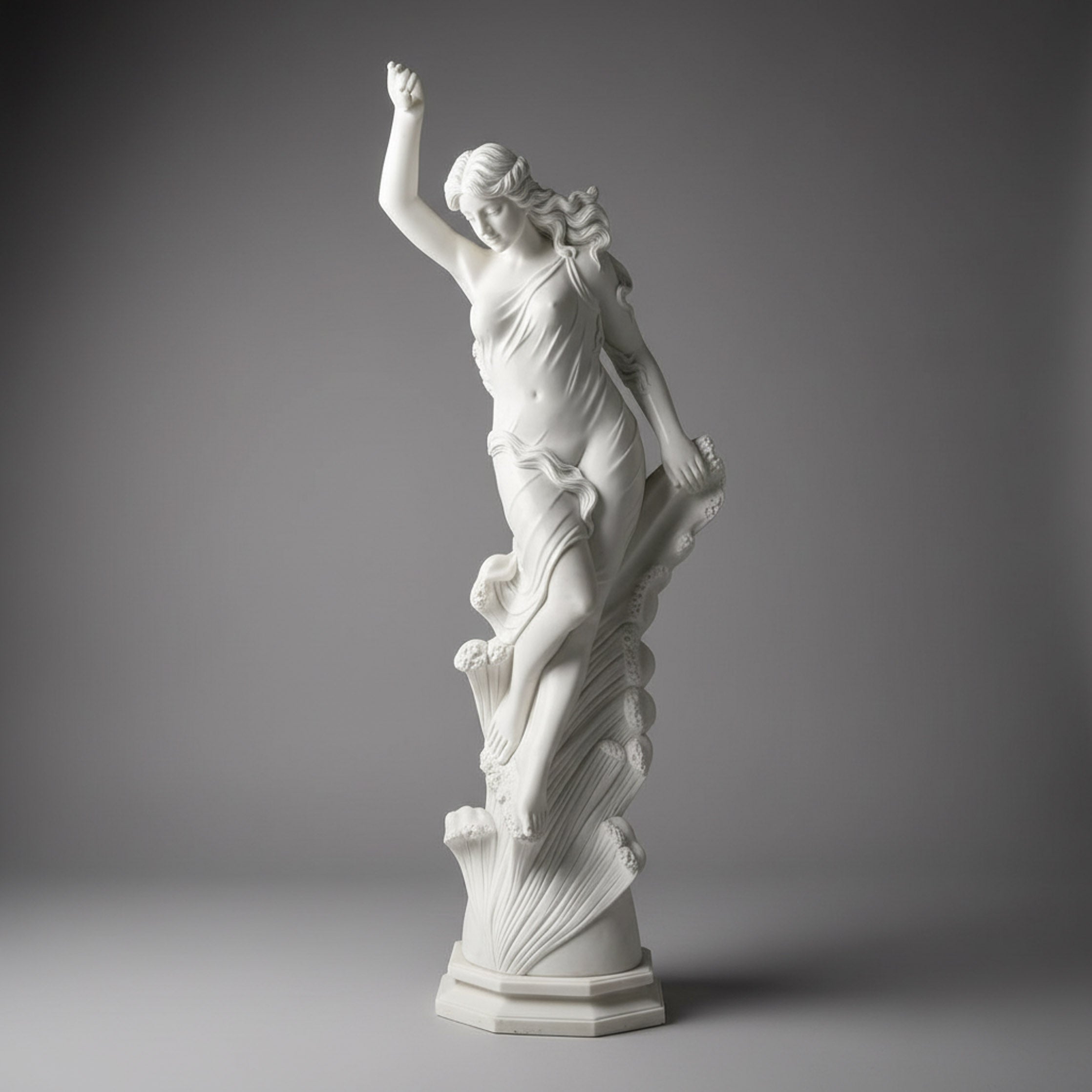 This marble sculpture for sale depicts a sea goddess rising from stylized waves, her body arching upward with one arm lifted in a triumphant gesture. Long, flowing hair cascades down her back in rippling strands that echo the swirling base beneath her bare feet. A clinging, partially draped garment wraps diagonally across the torso and hips, revealing elegant curves while maintaining classical modesty. Carved from luminous white marble, this dynamic figure makes a dramatic focal point near pools, coastal gardens, or ocean-inspired interior spaces.