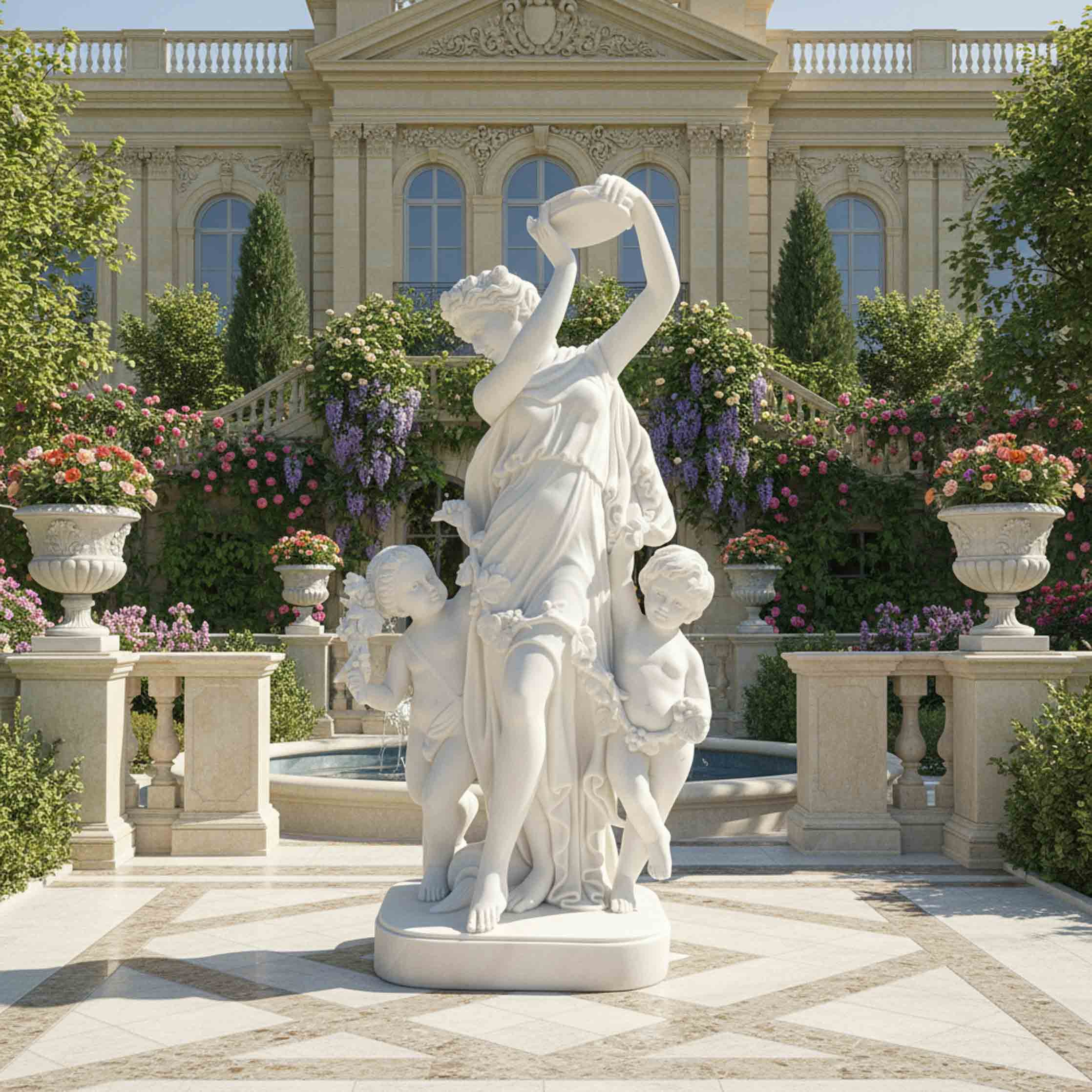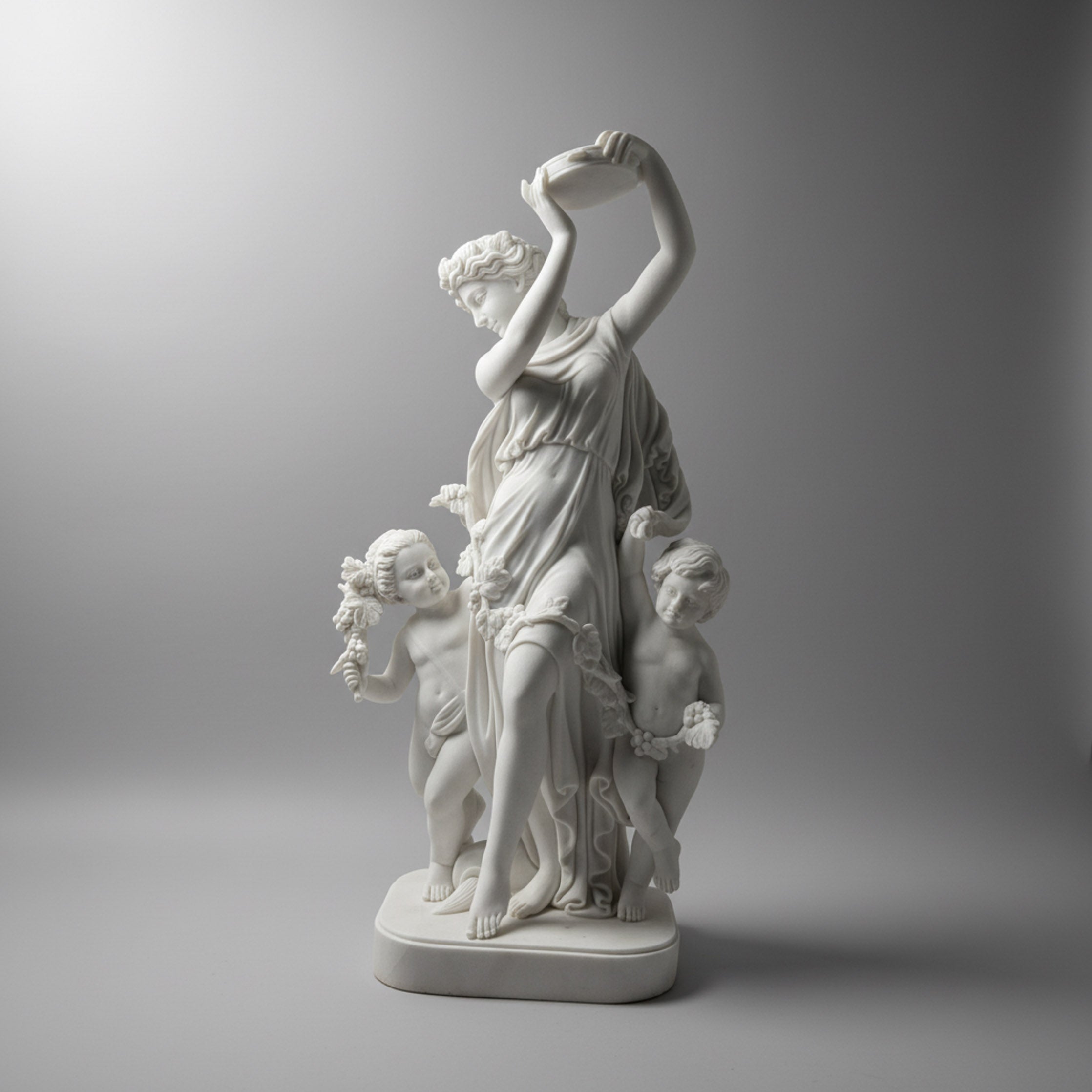 This marble sculpture for sale captures a graceful young mother dancing forward with two playful cherubs clustered at her feet, all carved from soft white marble. She lifts a round tambourine high above her head, arms arcing elegantly as her draped gown clings to the figure and flares into rippling folds. Garlanded blossoms trail along the hem and across her waist, where one child tugs at the fabric while the other holds a carved floral spray. Bare feet, rounded limbs, and the smooth, gently speckled marble surface give this lively composition a warm, celebratory presence.