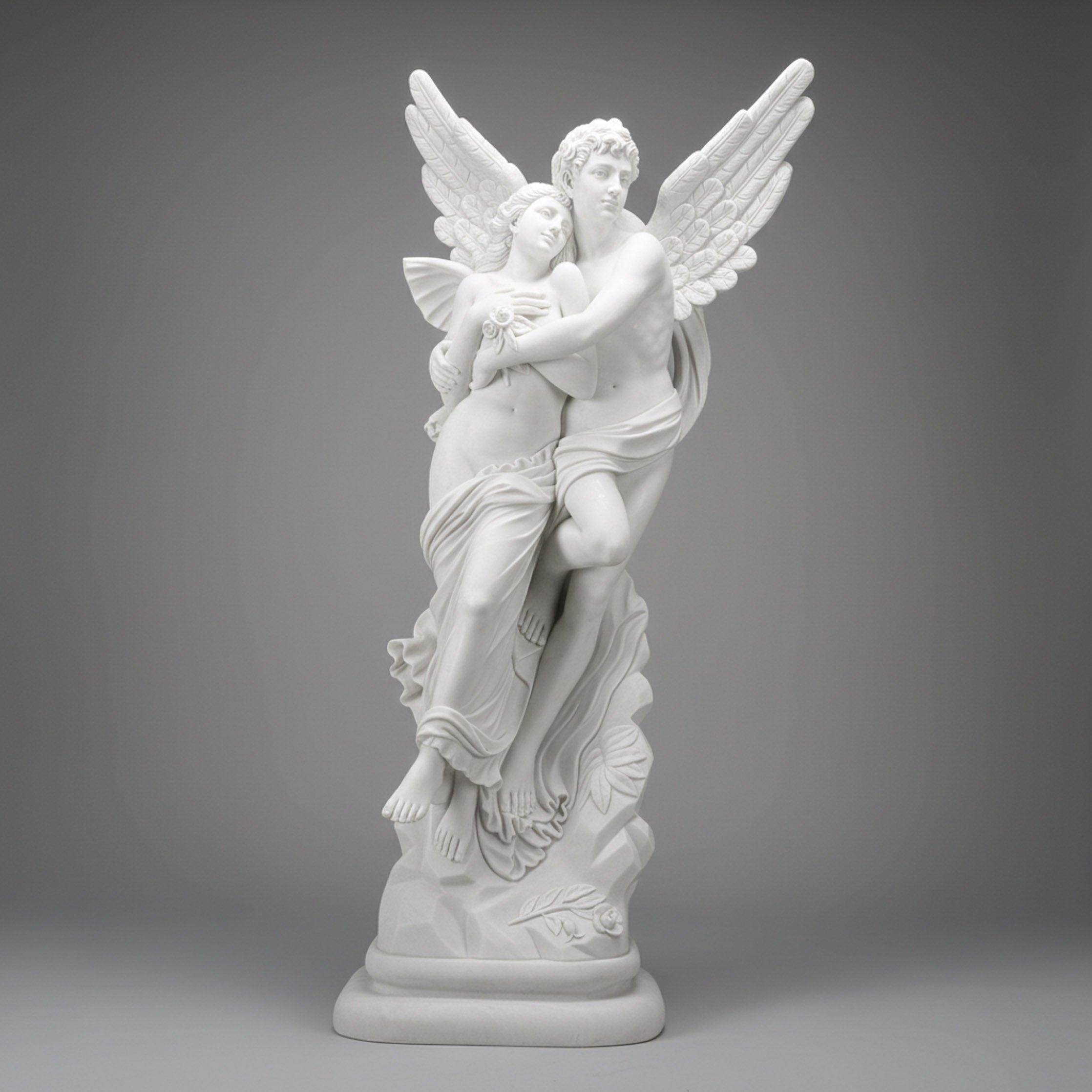 This marble sculpture portrays two angelic lovers entwined in a tender embrace, their expansive feathered wings arcing dramatically behind them. The male figure supports the female as she leans into his chest, clutching a carved rose that reinforces the romantic theme. Flowing drapery wraps around their lower bodies and cascades over a rocky base, with polished folds and bare feet adding lifelike detail. Crafted from luminous white marble, this romantic piece makes a powerful statement in courtyards, wedding venues, or interiors that celebrate love and devotion.
