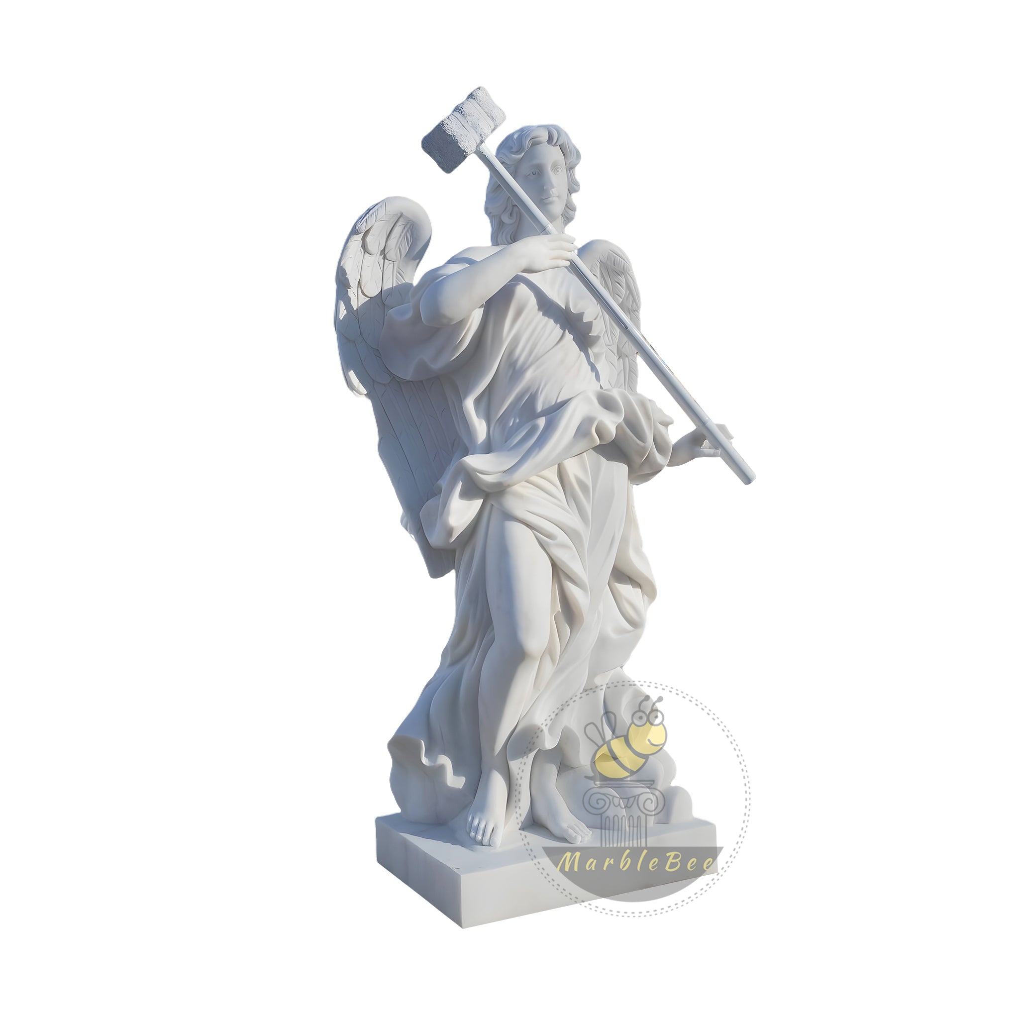 This white marble sculpture features a dynamic, life-sized build of an Angel of the Passion. Carved with exquisite detail, the figure stands in a graceful contrapposto pose atop a solid, integral marble plinth. An eccentric feature is the long, slender pole held diagonally across the body, topped with a highly textured, porous-looking sponge rendered in stone. The build is characterized by voluminous, swirling drapery that creates a sense of celestial movement. The pure white material enhances the soft, youthful facial features and the intricate, feathered layers of the expansive wings.