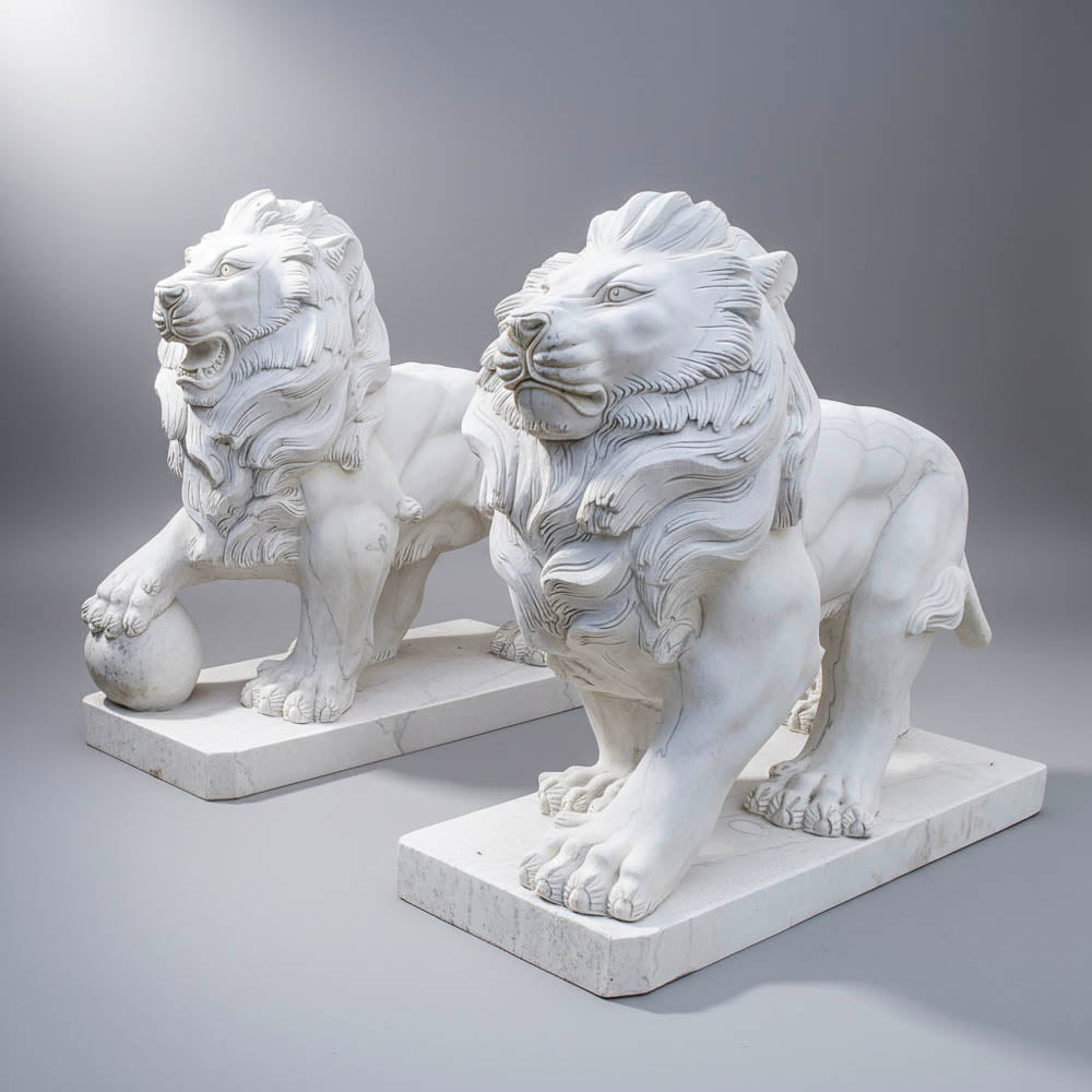 A commanding pair of hand-carved marble lion sculptures, crafted from luminous Masha white marble. These powerful guardians, with one paw on a sphere, stride with dignified grace, showcasing exquisite detail