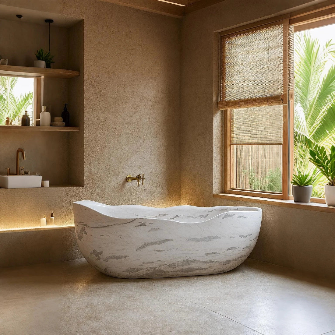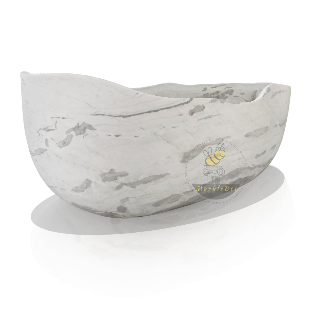 This bathtub reveals a smooth, wave-like edge with a pristine white marble surface, accented by subtle grey veining that creates a distinctive, flowing pattern. The solid structure offers a durable and comfortable soaking experience, ideal for a bathroom seeking a custom artistic touch. The design embodies a Contemporary style, marked by sleek sophistication and modern elegance.