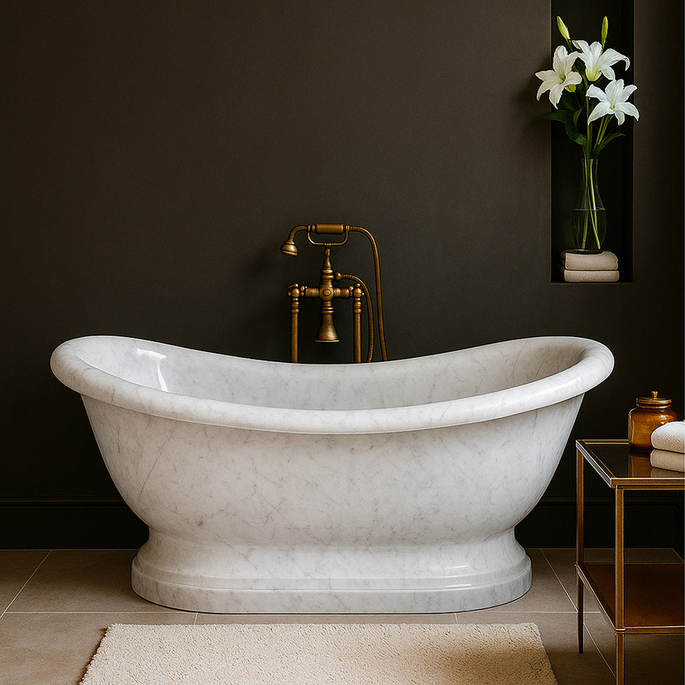 The rich, natural white tone of the marble and the beautiful gray patterns adorning its surface exude an air of luxurious relaxation. The stone pedestal sink becomes more than just a functional fixture; it transforms into a work of art that enhances the overall ambiance of your bathroom.