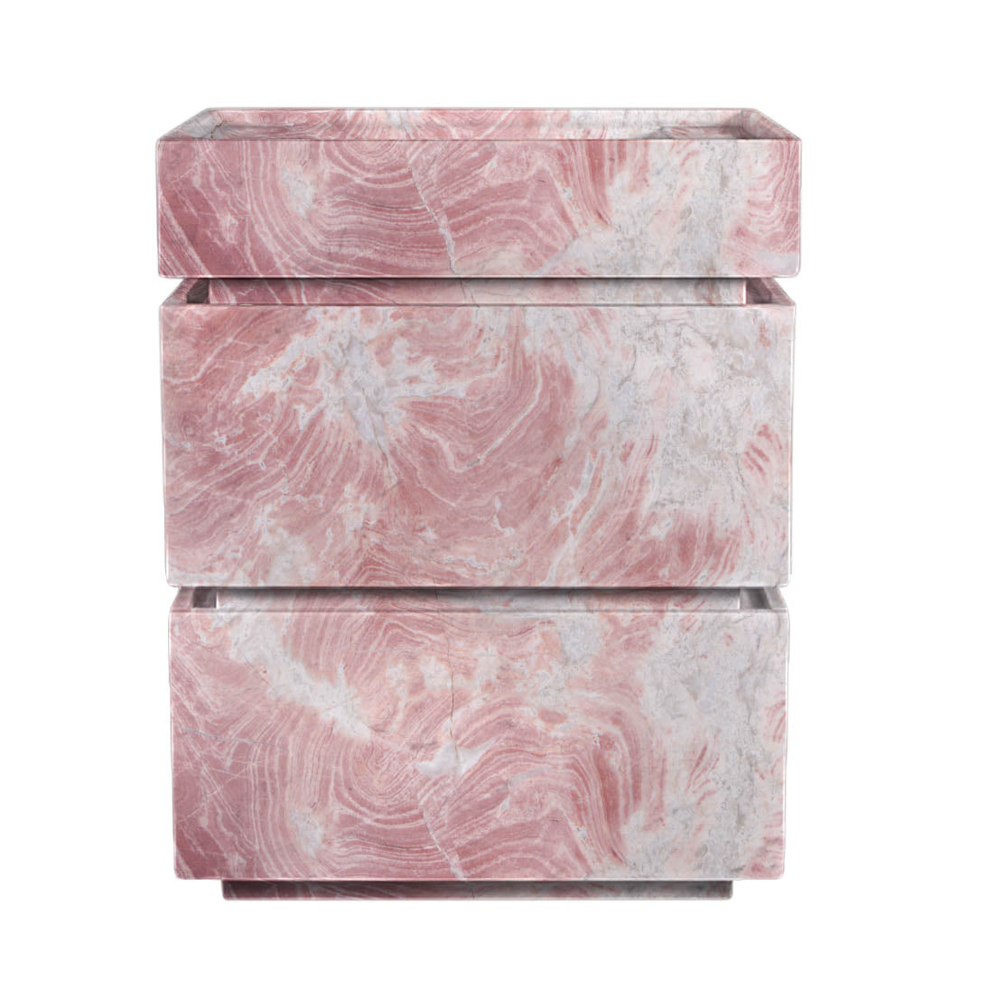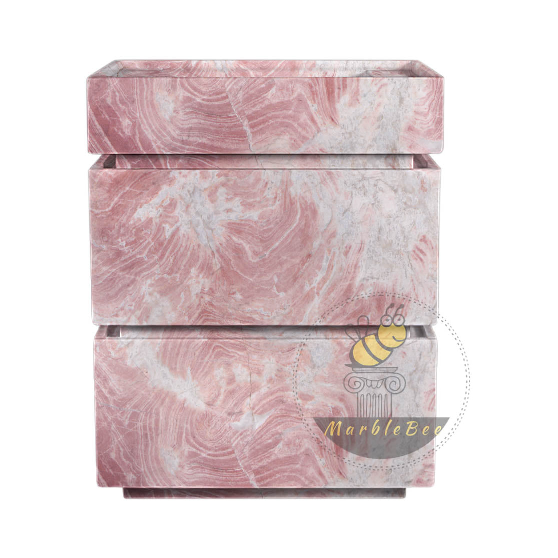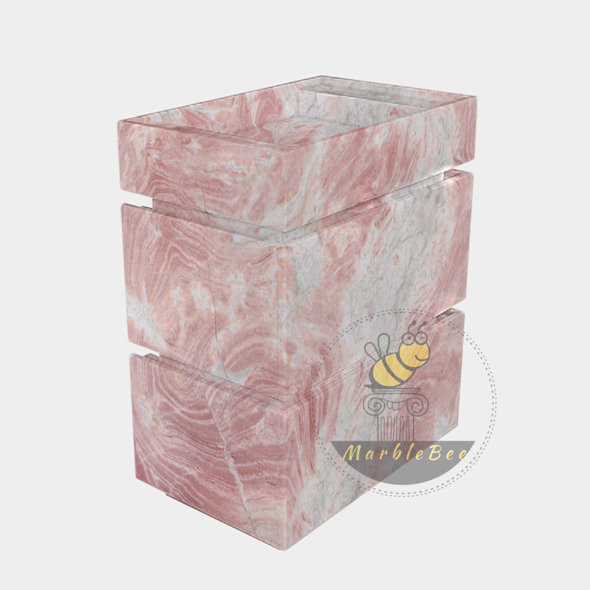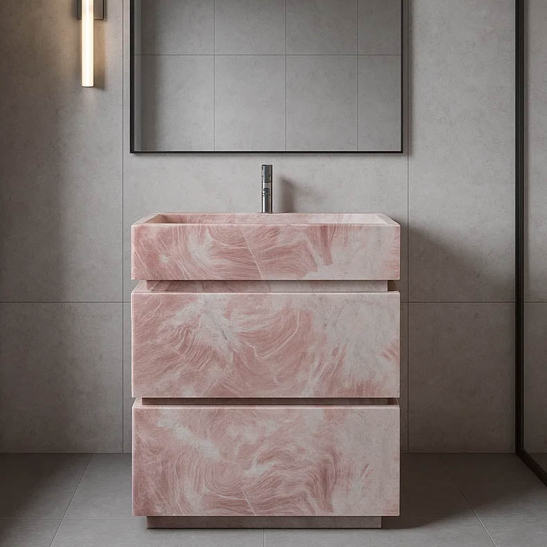 Introduce romantic sophistication to your bathroom with this exquisite Pink Marble Vanity Unit. Carved from luxurious natural marble, it features delicate rose and blush tones swirling through a soft white and grey backdrop, creating a serene and elegant effect. The modern, tiered design includes a seamlessly integrated sink, forming a stunning sculptural piece. Measuring 27.56" L x 17.72" W x 35.43" H, this vanity is a unique statement of artistry and opulence, perfect for creating a chic and tranquil high-end interior.