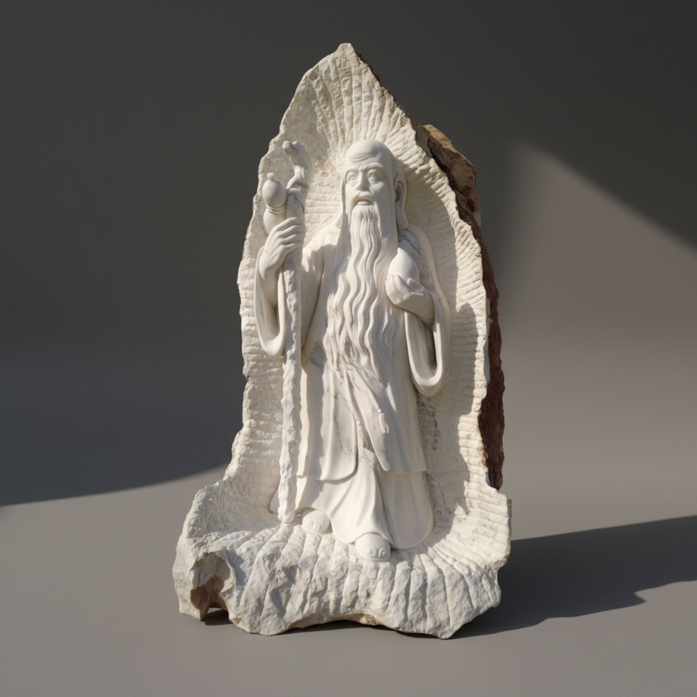 Invite blessings with this Relief sculpture of Shou Lao Marble Statue. As the God of Longevity, this figure is hand-carved from Moon White Marble, emerging from the raw stone. A unique, spiritual piece for your garden
