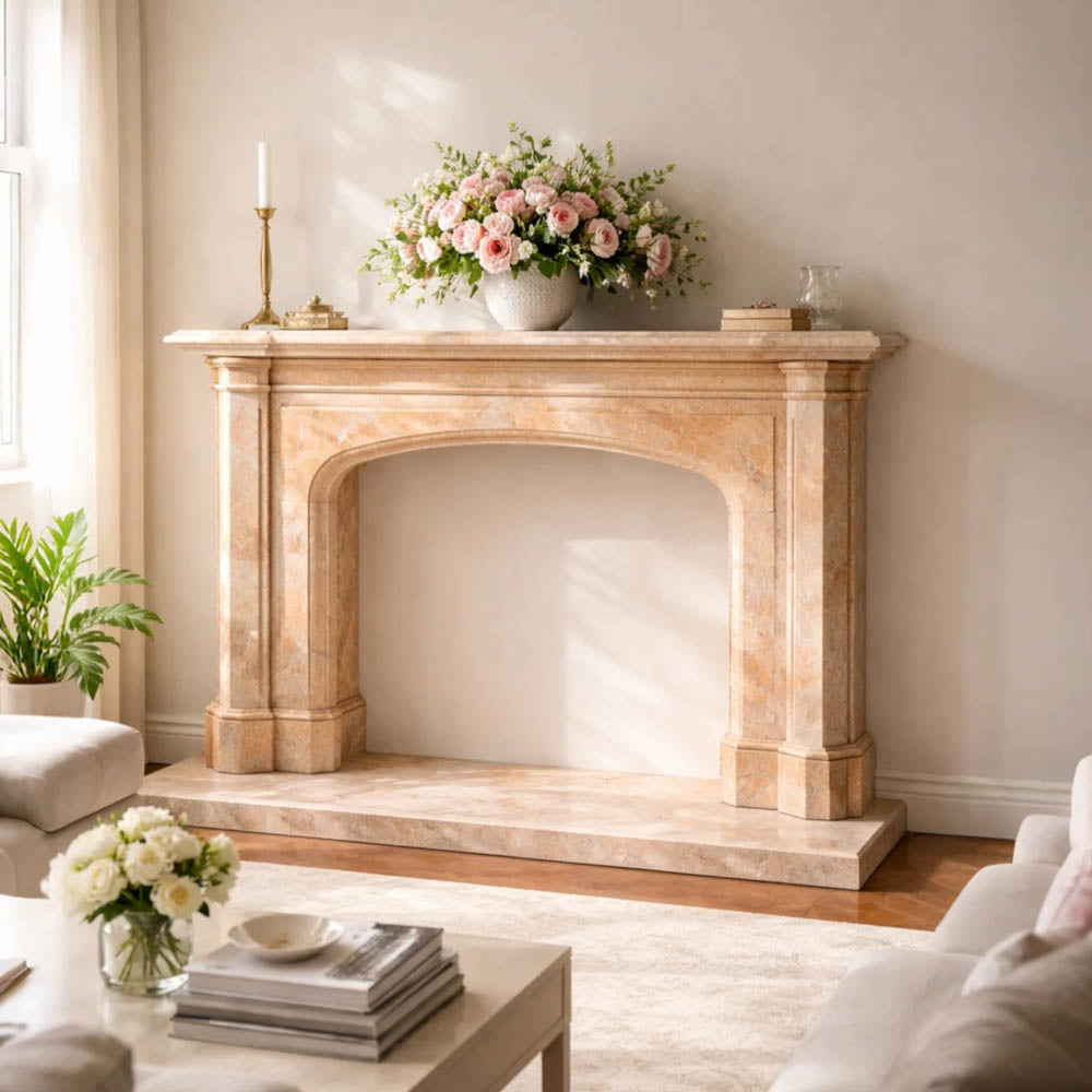 Hewn from Terra Imperialis, this simple marble fireplace mantel radiates understated beauty with its soft, earthy tones and clean lines. Its minimalist design creates an inviting highlight for any room. Ready today from our in-stock collection, or tailor it with our custom design service to suit your vision. This graceful mantel adds enduring sophistication to your space now.