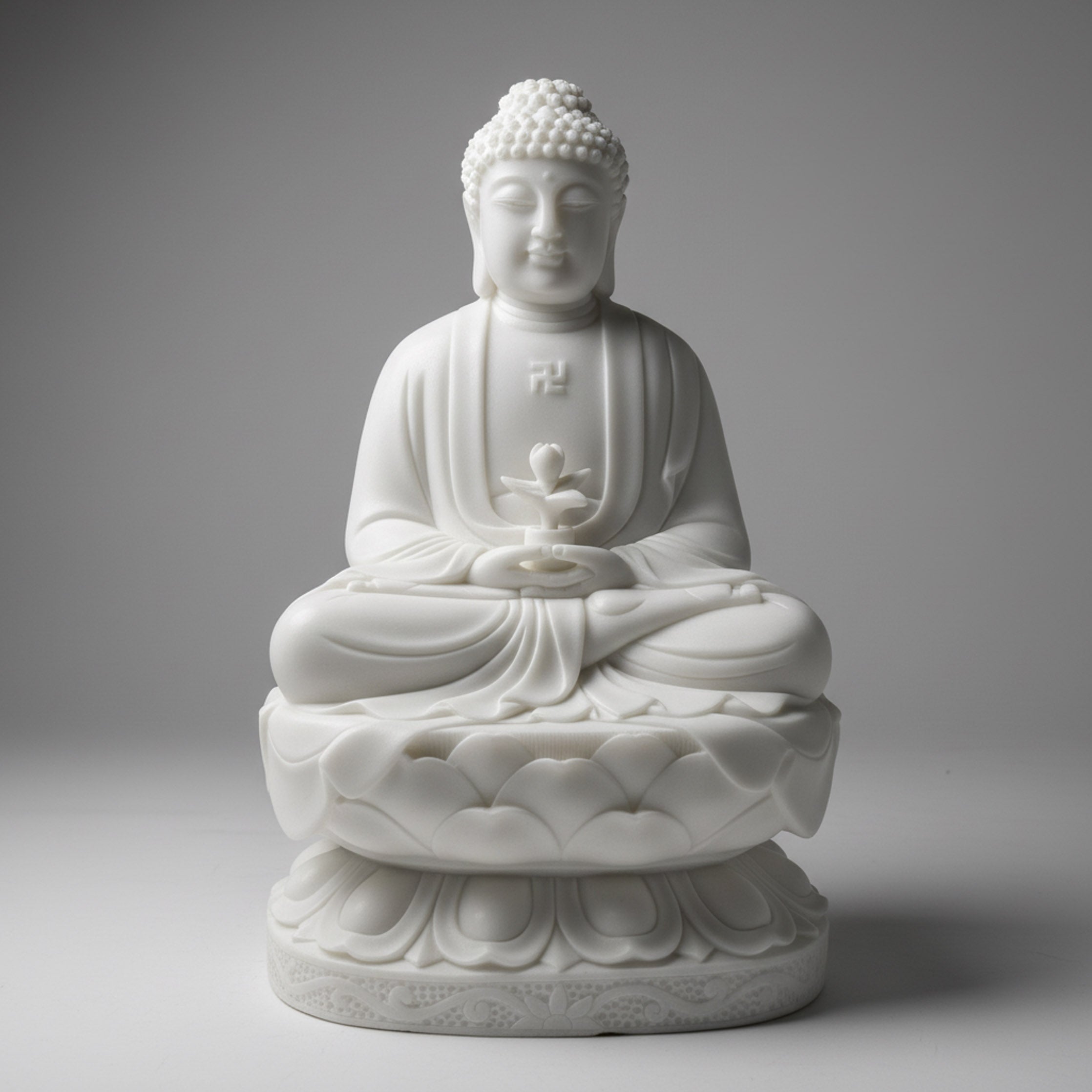 This stone Buddha garden statue shows a serene seated Buddha in deep meditation, hands gently cradling a budding lotus flower at the center of the lap. The robe flows in soft, rhythmic folds over crossed legs, while a traditional emblem rests at the chest, adding symbolic depth. He sits atop a double lotus pedestal richly carved with layered petals and egg-and-dart details that catch light beautifully outdoors. Sculpted entirely from smooth white marble, this peaceful statue is ideal for courtyards, meditation spaces, temple gardens, and tranquil water-feature settings.