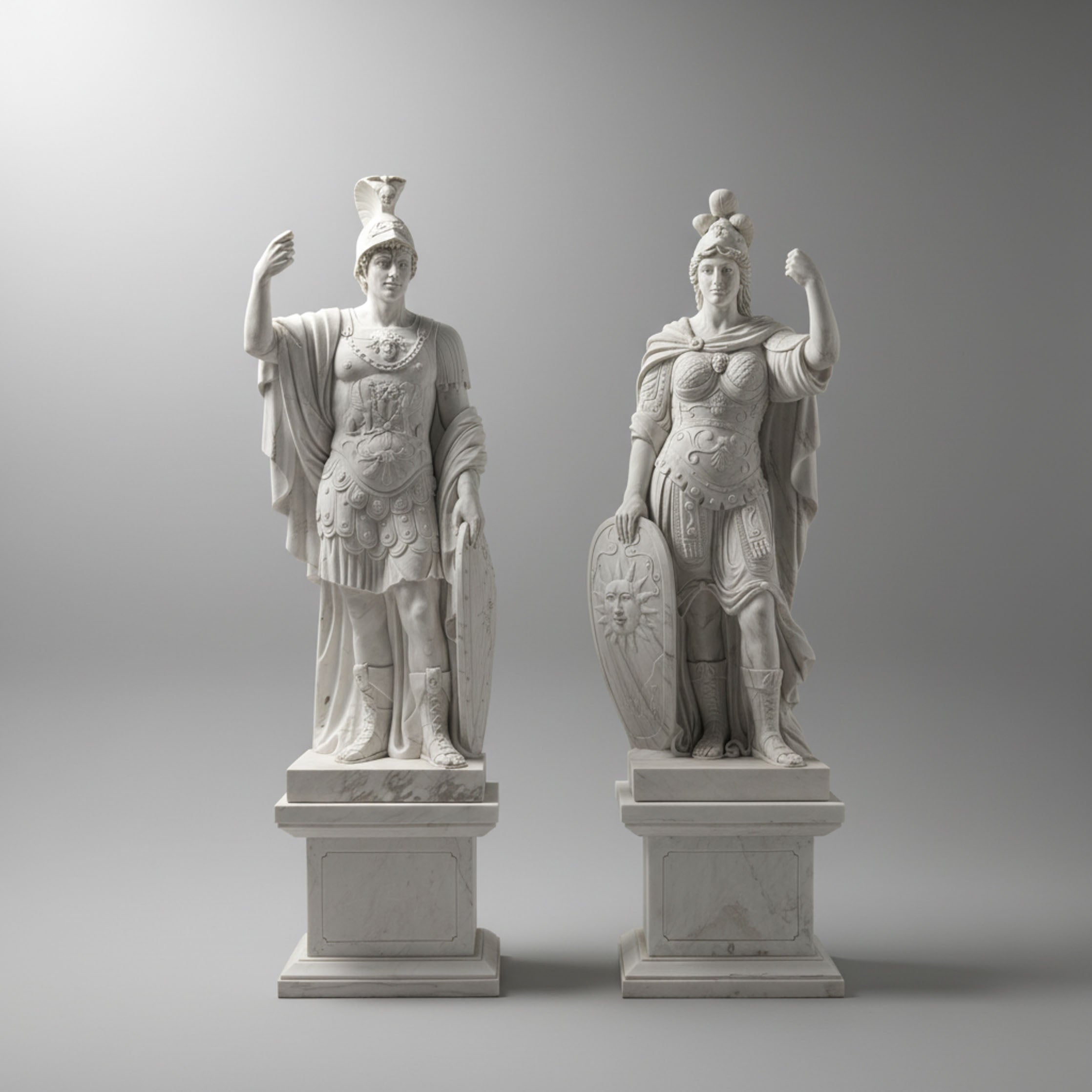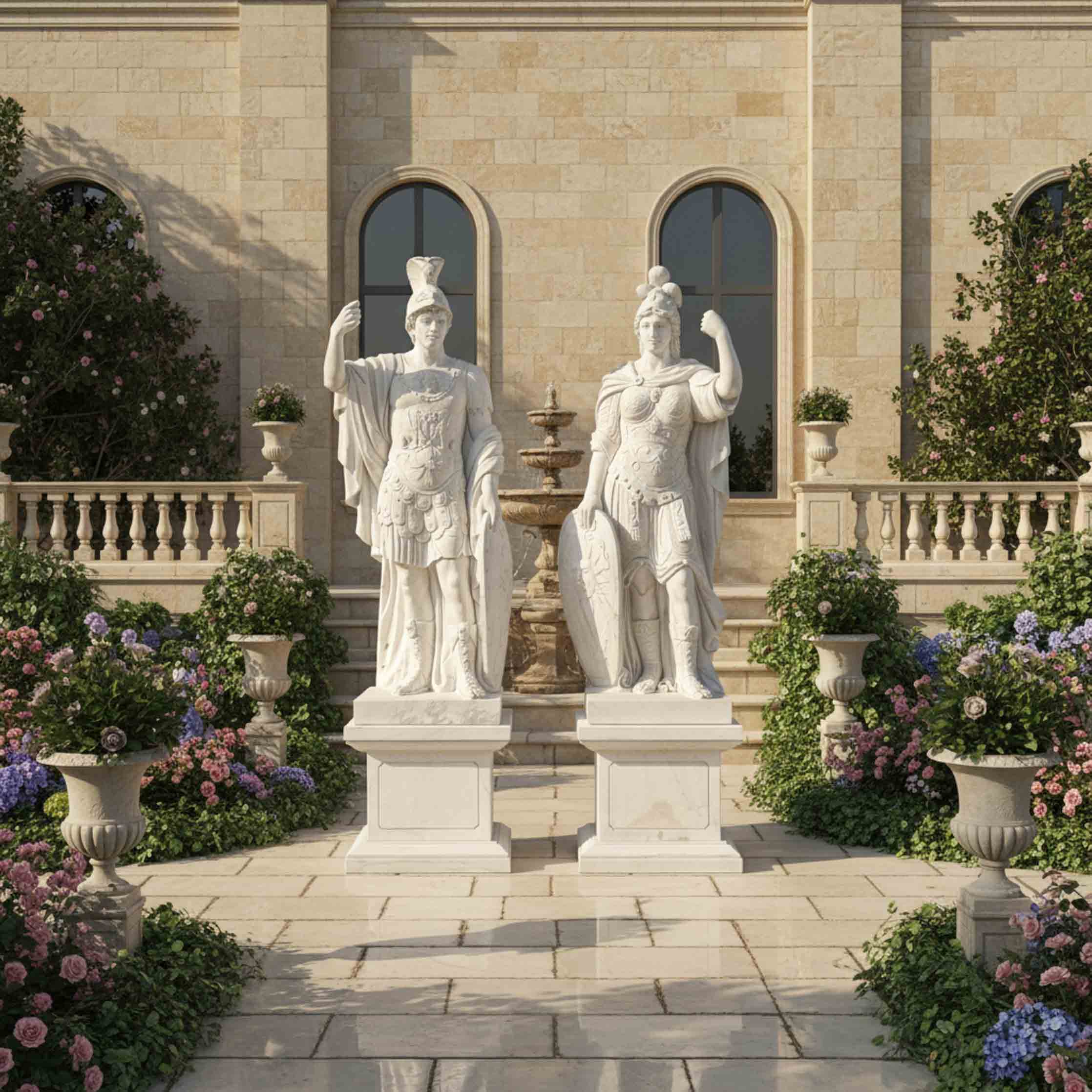 These stone garden ornaments feature a commanding pair of Roman‑style warriors, each standing on a tall rectangular plinth carved from solid white marble. Both figures wear ornate armor with layered scale corselets, tasselled skirts, and high lace‑up boots decorated with small mask faces on the shin guards. One warrior lifts a round shield engraved with scrolling motifs and mythic creatures, while the other raises a clenched fist as if addressing an unseen army. Flowing cloaks, crested helmets, and crisp surface detailing make this striking duo ideal for flanking grand pathways or estate entrances.