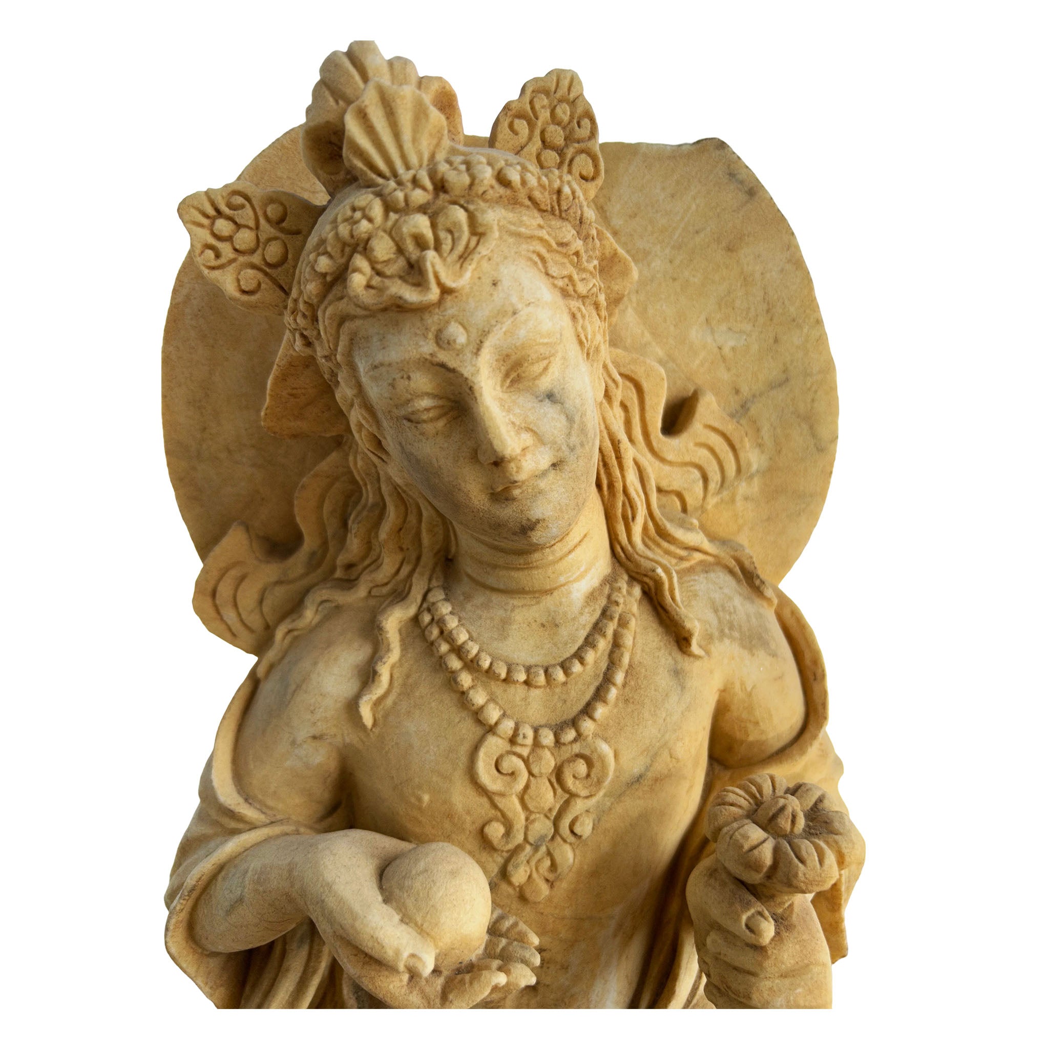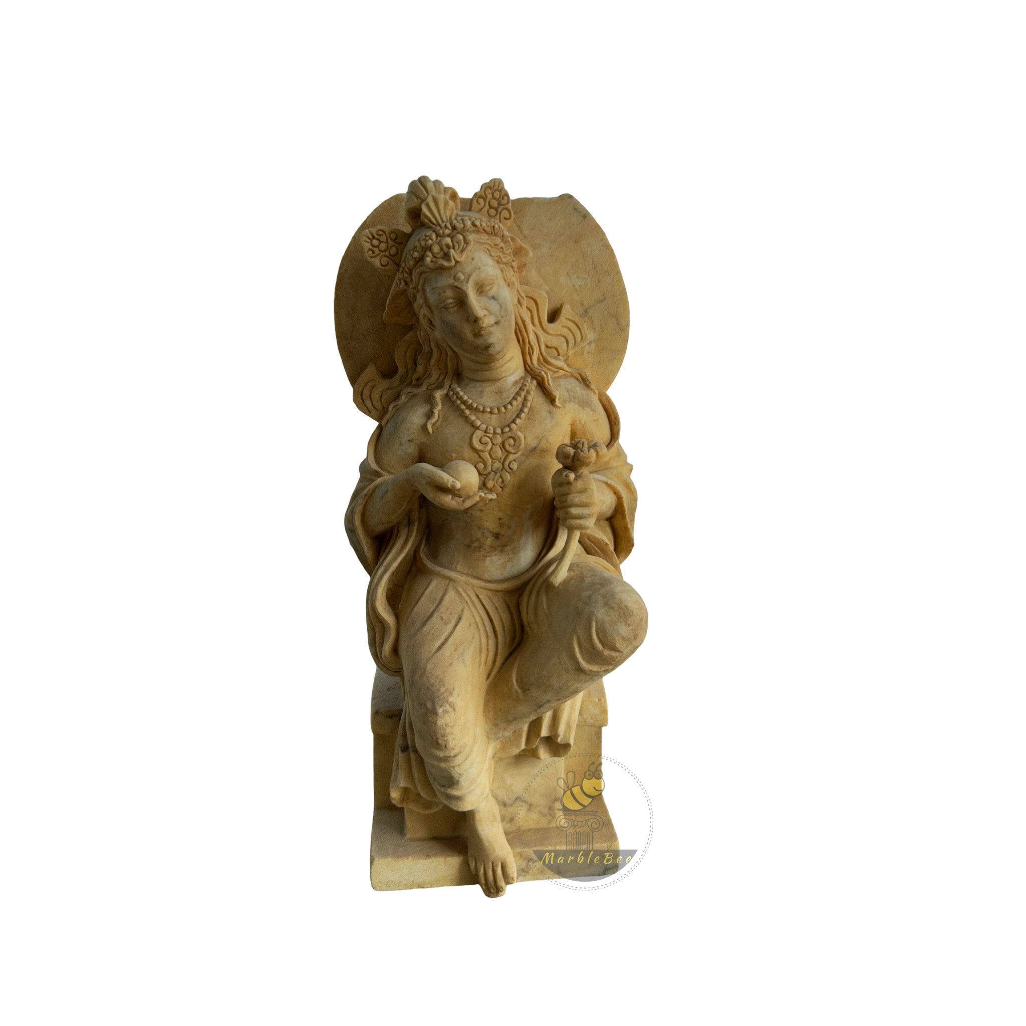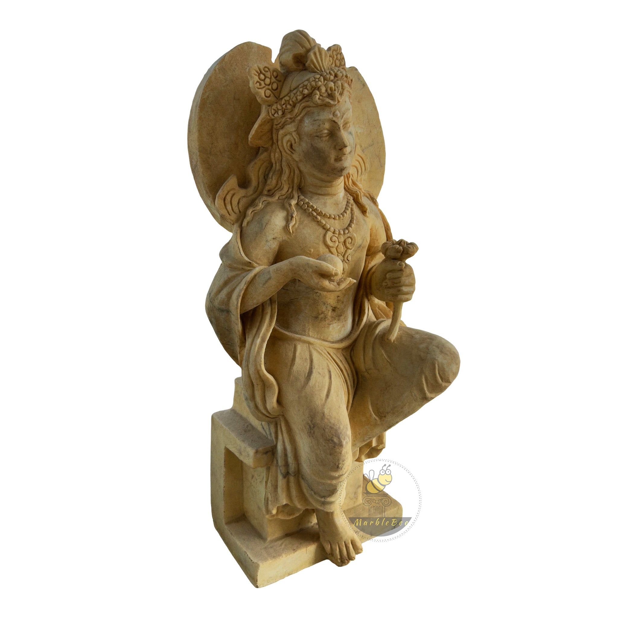 Masterfully carved from natural honey-toned Antiquing White marble, this sculpture depicts the Bodhisattva Avalokiteshvara in the graceful Lalitasana, or "Royal Ease," posture. The material’s distinct sedimentary banding enhances the fluid lines of the dhoti and the intricate jewelry. Holding a sacred citron and a long-stemmed lotus, the figure radiates an aura of compassionate abundance. This hand-chiseled piece captures the warmth and textural depth of traditional Indian temple carvings, offering a grounded yet celestial presence for a private gallery or garden sanctuary