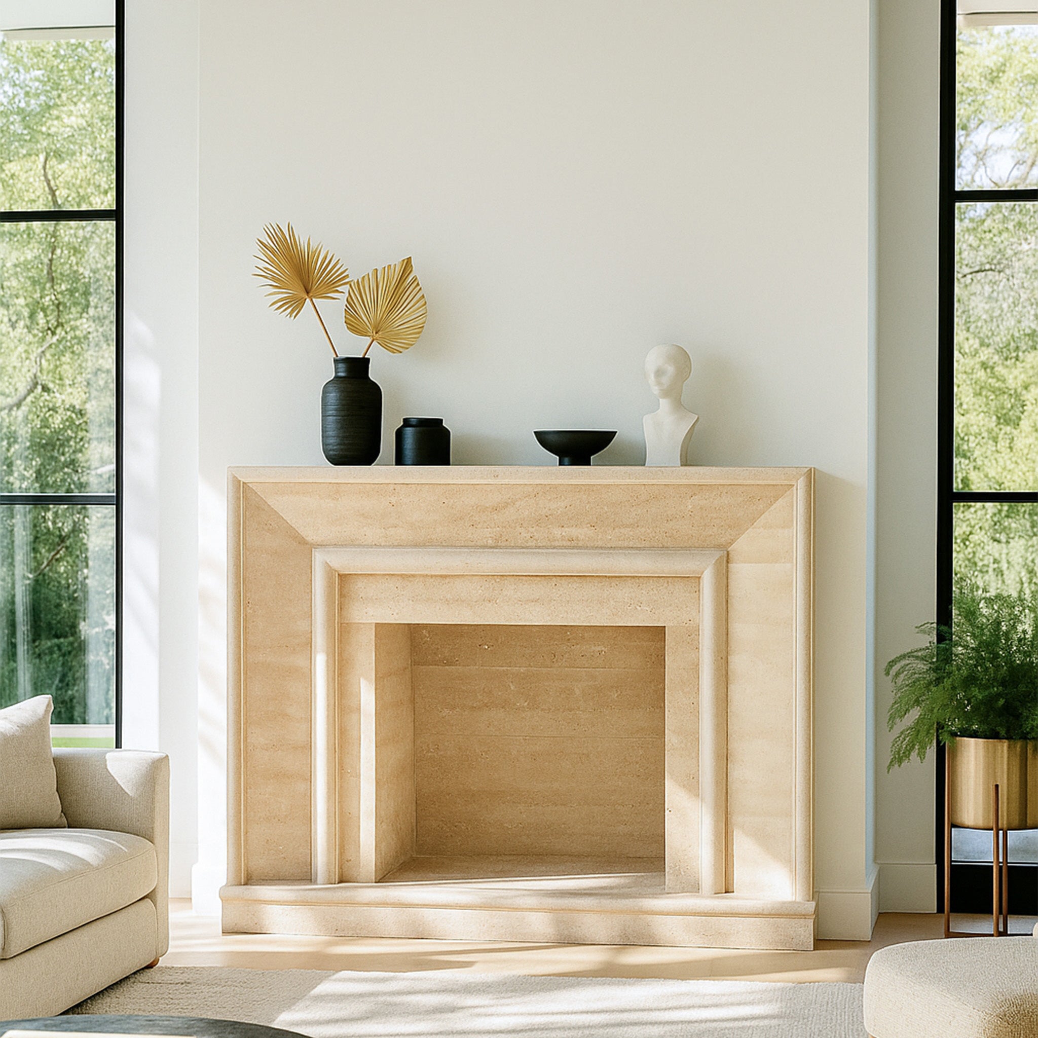 This contemporary fireplace surround, crafted from warm Beige Travertine, offers a serene and inviting aesthetic. Its clean, layered rectangular design highlights the natural porosity and subtle textural variations inherent in travertine, creating a unique tactile appeal. The stepped frame provides depth and visual interest without ornate details, allowing the natural beauty of the stone to be the focal point. Perfect for modern, rustic, or minimalist interiors seeking an elegant, earthy touch.