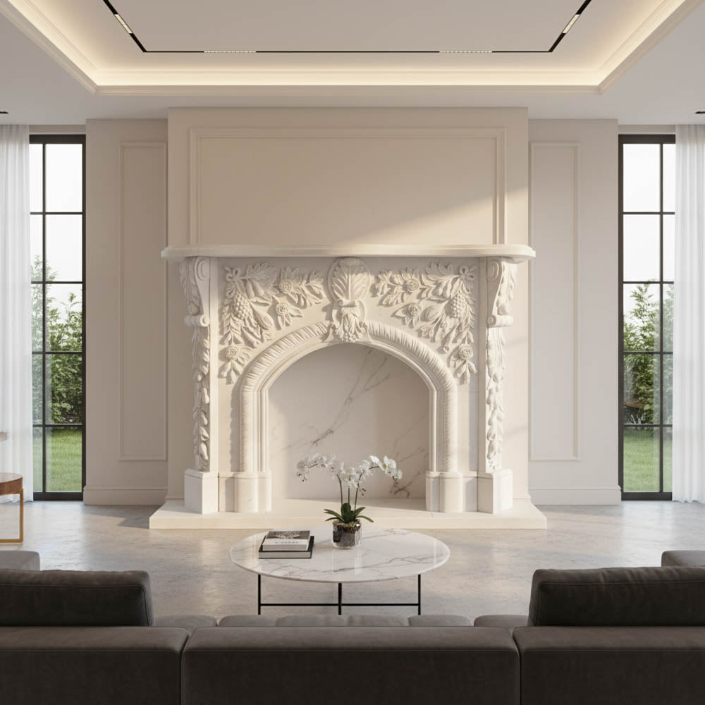 This fireplace mantel design boasts an intricate design with defined lines, impactful pillars, and exquisite floral motifs. The combination of these elements creates a sense of luxury and sophistication, making it a statement addition to any interior. Its defined lines and edges further contribute to its overall opulence.