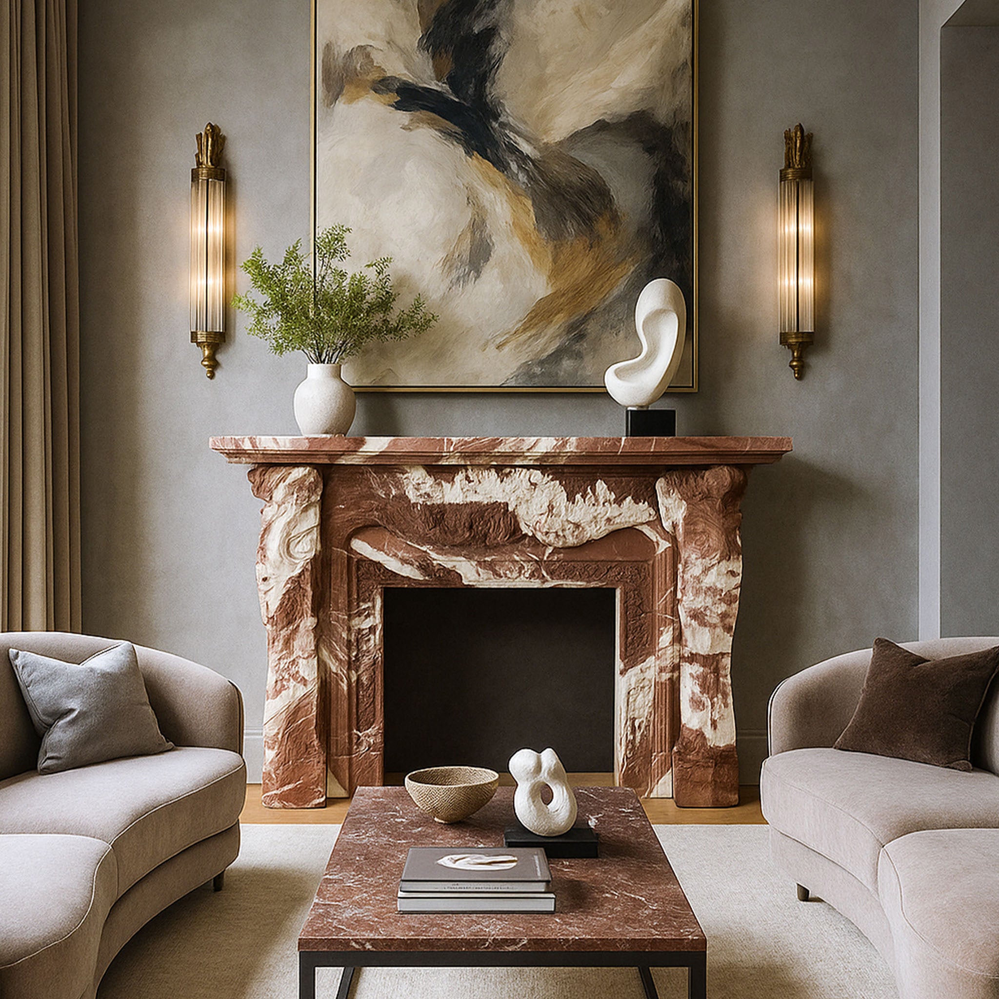 Transform your living space with this exquisite red marble fireplace featuring a striking white pattern. Its simple yet elegant design perfectly complements traditional home decor, adding warmth and sophistication. Gather around the fireplace to create cherished memories in a beautiful setting that exudes timeless charm.
