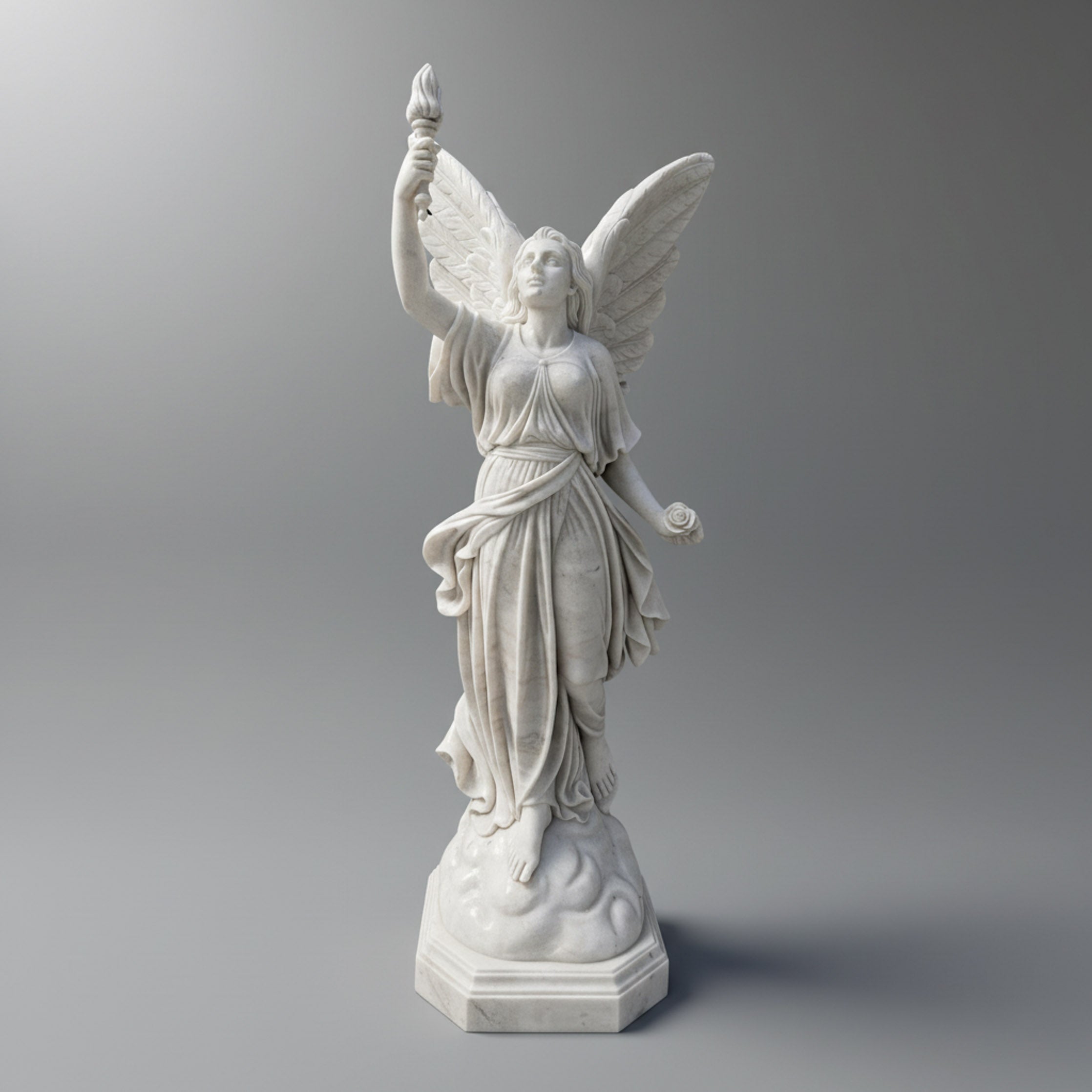 This majestic white marble winged angel statue rises gracefully on a domed pedestal, one bare foot stepping forward as if descending from the heavens. Her wide, feather‑rich wings flare outward, each plume deeply carved for dramatic texture and shadow. The angel lifts a torch skyward, symbolizing victory, guidance, and divine light, while her flowing robe wraps in soft, layered folds around her slender form. Ideal for entryways, memorial gardens, or spiritual retreats, this sculpture creates an inspiring focal point that feels both uplifting and serene, especially when framed by greenery, water features, or subtle lighting.